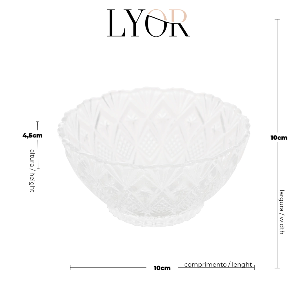 A Lyor pensando em facilitar, traz o Bowl de Vidro King, ideal para seu dia a dia ou até mesmo aquela reunião com amigos ou familiares. Com capacidade de 80ml é multifuncional em sua cozinha! Além disso ele é todo trabalhado dando um toque especial na decoração da sua casa!